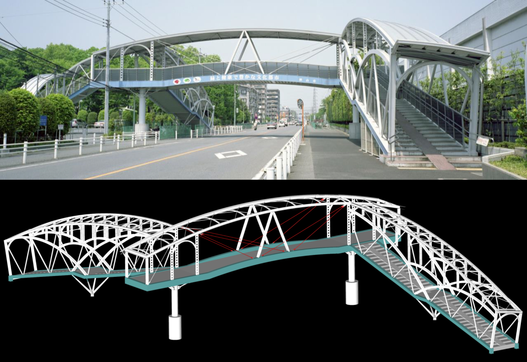 曲げ剛性を持つ上弦材の下部に、束材を介して引張材を取り付けた構造です。引張材の張力を変化させることにより自重時における上弦材の曲げ応力と変形をコントロールすることで、部材を小さくすることができます。